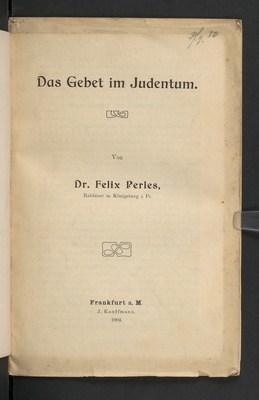 Das Gebet im Judentum / von Dr. Felix Perles (Rabbiner in Königsberg i. Pr.)