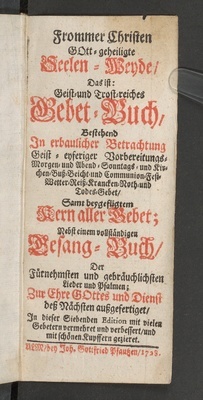 Frommer Christen Gott-geheiligte Seelen-Weyde, Das ist: Geist- und Trost-reiches Gebet-Buch, Bestehend In erbaulicher Betrachtung Geist-eyferiger Vorbereitungs-Morgen- und Abend- Sonntags- und Kirchen- Buß-Beicht- und Communion-Fest-Wetter-Reiß-Krancken-Noth-und Todes-Gebet, Samt beygefügtem Kern Aller Gebet; Nebst einem vollständigen Gesang-Buch Der Fürnehmsten und gebräuchlichsten Lieder und Psalmen; Zur Ehre Gottes und Dienst deß Nächsten außgefertiget