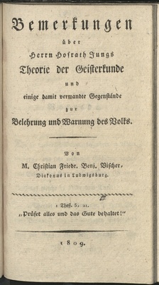 Bemerkungen über Herrn Hofrath Jungs Theorie der Geisterkunde und einige damit verwandte Gegenstände zur Belehrung und Warnung des Volks / von M. Christian Friedr. Benj. Vischer Diakonus in Ludwigsburg