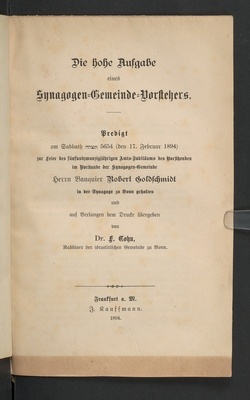 Die hohe Aufgabe eines Synagogen-Gemeinde-Vorstehers : Predigt am Sabbath Tezawe 5654 (den 17. Februar 1894) zur Feier des fünfundzwanzigjährigen Amts-Jubiläums des Vorsitzenden im Vorstande der Synagogen-Gemeinde Herrn Banquier Robert Goldschmidt in der Synagoge Bonn / gehalten und auf Verlangen dem Drucke übergeben von Dr. F. Cohn (Rabbiner der israelitischen Gemeinde zu Bonn)