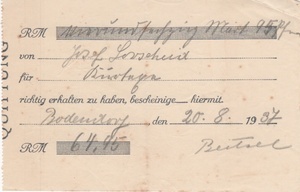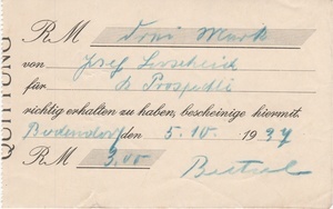 Quittung über die Einzahlung der Kurtaxen an die Gemeinde Oktober 1937