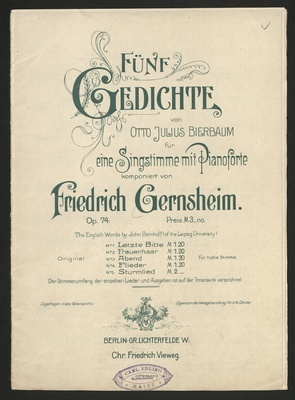 Fünf Gedichte : für eine Singstimme mit Pianoforte ; op. 74 / von Otto Julius Bierbaum. Komp. von Friedrich Gernsheim. The English words by John Bernhoff