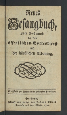 Neues Gesangbuch, zum Gebrauch bey dem öffentlichen Gottesdienst und der häuslichen Erbauung : mit Fürstl. Or. Nassauischem gnädigsten Privilegio