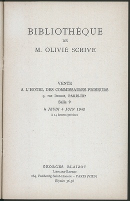 Bibliothèque de M. Olivié Scrive : vente a l'Hotel des Commissaires-Priseurs, le jeudi 4 juin 1942 / Georges Blaizot, libraire-expert