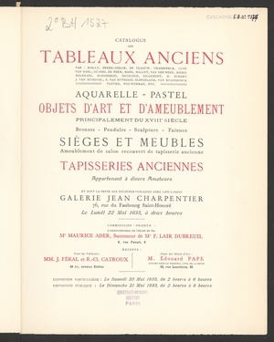 Catalogue des tableaux anciens par: Boilly, Brekelenkam, De Claeuw, ..., aquarelle, pastel, objets d'art et d'ameublement principalement du XVIIIe siècle : bronzes, pendules, sculpture, faïence, sièges et meubles, ameublement de salon recouvert de tapisserie ancienne, tapisseries anciennes; appartenant à divers amateurs; et dont la vente aux enchères publiques aura lieu à Paris, Galerie Jean Charpentier, le lundi 22 mai 1933 / Commissaire-Priseur: Maurice Ader