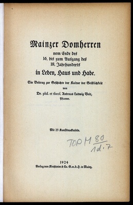 Mainzer Domherren vom Ende des 16. bis zum Ausgang des 18. Jahrhunderts in Leben, Haus und Habe : ein Beitrag zur Geschichte der Kultur der Geistlichkeit / von Andreas Ludwig Veit