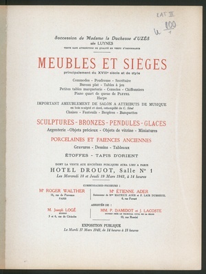 Meubles et sièges principalement du XVIIIe siècle et de style : succession de Madame la Duchesse d'Uzès née Luynes; commodes, poudreuse, secrétaire, ... ; important ameublement de salon à attributs de musique ... ; sculptures, bronzes, pendules, glaces, argenterie, objets précieux, objets de vitrine, miniatures; porcelaines et faiences anciennes, gravures, dessins, tableaux, étoffes, tapis d'orient, dont la vente aux enchères publiques aura lieu à Paris, Hotel Drouot, 18 et 19 mars 1942 / commissaires-priseurs: Me Roger Walther, Paris ...