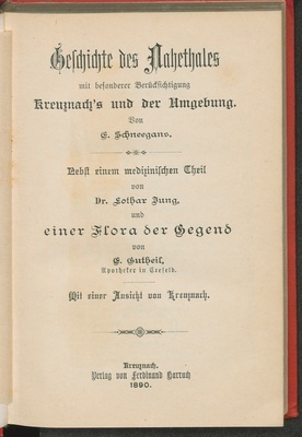 Geschichte des Nahethales mit besonderer Berücksichtigung Kreuznach's und der Umgebung / von E. Schneegans. Nebst einem med. Theil von Lothar Jung und einer Flora der Gegend von E. Gutheil