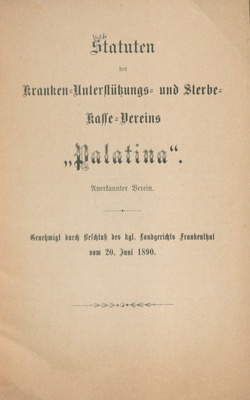 Statuten des Kranken-Unterstützungs- und Sterbe-Kasse-Vereins "Palatina" : anerkannter Verein ; genehmigt durch Beschluß des kgl. Landgerichts Frankenthal vom 20. Juni 1890