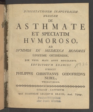 Dissertationem Inavgvralem Medicam De Asthmate Et Speciatim Hvmoroso, Ad Svmmos In Medicina Honores Legitime Obtinendos, Die XXXI. Maii Anni MDCCLXXVI. / Ervditorvm Examini Svbiicit Philippvs Christianvs Godofredvs Nebel, Wormatiensis.