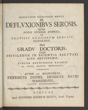 Dissertatio inavgvralis medica de deflvxionibvs serosis / qvam ...Pvblico Ervditorum Examini D. XVIII. Martii MDCCLXXXII. svbmittet avtor et respondens Fridericvs Daniel Henricvs David Schazmann, Castro-Friedbergensis