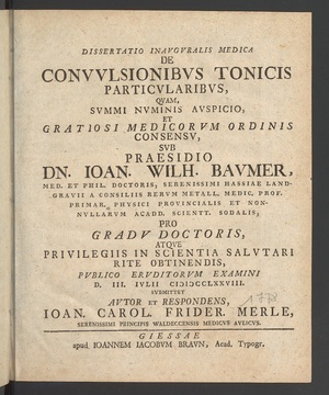 Dissertatio inavgvralis medica de convvlsionibvs tonicis particvlaribvs / qvam, svmmi nvminis avspicio, et gratiosi medicorvm ordinis consensv, svb praesidio Dn. Ioan. Wilh. Bavmer, Med. Et Phil. Doctoris, Serenissimi Hassiae Landgravii A Consiliis rervm Metall. Medic. Prof. Primar. Physici Provincialis Et Nonnvllarvm Acadd. scientt. Sodalis, pro gradv doctoris, atqve privilegiis in scientia salvtari rite obtinendis, pvblico ervditorvm examini D. III. Ivlii MDCCLXXVIII. svbmittet avtor et respondens, Ioan. Carol. Frider. Merle, Serenissimi Principis Waldeccensis Medicvs Avlicvs.