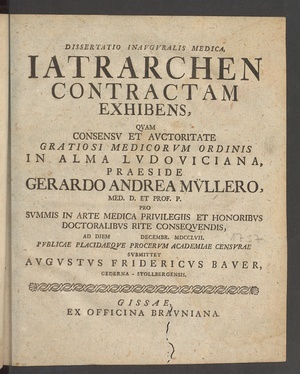 Dissertatio Inavgvralis Medica Iatrarchen Contractam Exhibens / qvam ... praeside Gerardo Andrea Müllero ... Svbmittet Avgvstvs Fridericvs Baver, Gederna-Stollbergensis.