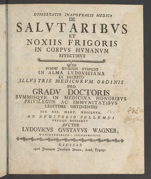 Dissertatio inavgvralis medica de salvtaribvs et noxiis frigoris in corpvs hvmanvm effectibvs / qvam ... In Alma Lvdoviciana ex decreto Illvstris Medicorvm Ordinis pro gradv doctoris ... Die XXI. Mart. MDCCLXXX. An Avditorio Sollemni pvblice defendet avctor Lvdovicvs Gvstavvs Wagner, Waechtersbaco - Isenbvrgicvs
