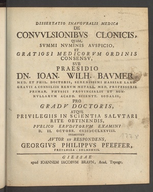 Dissertatio Inavgvralis Medica De Convvlsionibvs Clonicis / Qvam ... Praesidio Dn. Ioan. Wilh. Bavmer ... Pro Gradv Doctoris ... D. II. Octobr. MDCCLXXVIII. Svbmittet Avctor Et Respondens Georgivs Philippvs Pfeffer Freyensea-Solmensis