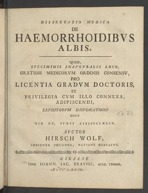 Dissertatio Medica De Haemorrhoidibvs Albis / Qvam, Speciminis Inavgvralis Loco, Gratiosi Medicorvm Ordinis Consensv, Pro Licentia Gradvm Doctoris, Et Privilegia Cvm Illo Connexa, Adipiscendi, Ervditorvm Diivdicationi Sistit Die XV. Ivnii MDCCLXXIX. Avctor Hirsch Wolf, Lobsenza Polonvs, Natione Hebraevs.