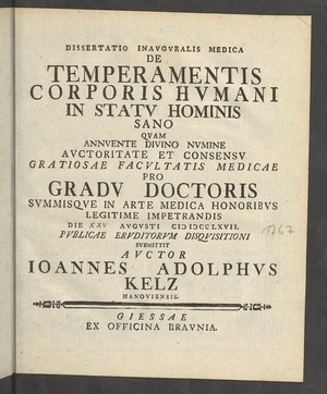 Dissertatio Inavgvralis Medica De Temperamentis Corporis Hvmani In Statv Hominis Sano / Qvam Annvente Divino Nvmine Avctoritate Et Consensv Gratiosae Facvltatis Medicae Pro Gradv Doctoris ... Die Avgvsti MDCCLXVII. Svbmittit Avctor Ioannes Adolphvs Kelz, Hanoviensis.