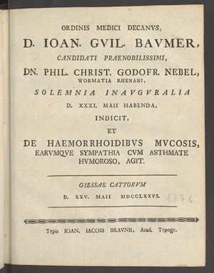 Ordinis Medici Decanvs Ioan. Gvil. Bavmer, Candidati Praenobilissimi, Dn. Phil. Christ. Godofr. Nebel, Wormatia Rhenani, Solemnia Inavgvralia D. XXXI. Maii Habenda, Indicit, Et De Haemorrhoidibvs Mvcosis, Earvmqve Sympathia Cvm Asthmate Hvmoroso Agit