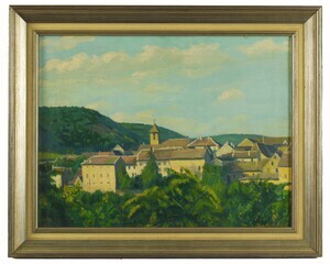 Der Ort Lachen-Speyerdorf mit Blick auf das Hambacher Schloss