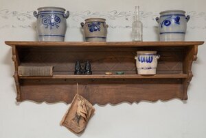 Wandregal mit Zwiebltöpfchen und Glasflasche
