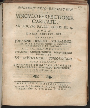Dissertatio Exegetica De Vincvlo Perfectionis, Caritate : Ad Locvm Pavlli Colos. III. 14. / Quam ... Praeside Johanne Henrico Schrammio, Th. D. Et Profes. Consil. Eccles. Inspectore Et Pastore A. D. XII. Maii MDCCXXX. Publicae Commilitonvm Disqvisitioni Submittet In Avditorio Theologico Hora Consveta Johannes Philippvs Nicolavs Mvllervs, Horsbaco Bipontinvs Th. Stvdiosvs