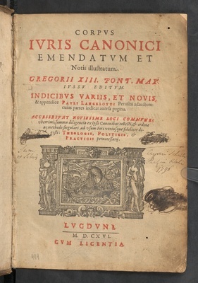 Corpvs Ivris Canonici Emendatvm Et Notis Illvstratvm : Accesserunt Nouissimè Loci Commvnes vberrimi, summa diligentia ex ipsis Canonibus collecti, & ordine ac methodo singulari ad vsum Fori vtriusq[ue] fideliter Digesti: Theologis, Politicis, & Practicis perneccessarij / Gregorii XIII. Pont. Max. iussu editum. Indicibvs Variis, Et Novis, & appendice Pavli Lanceloti, Perusini adauctum ...