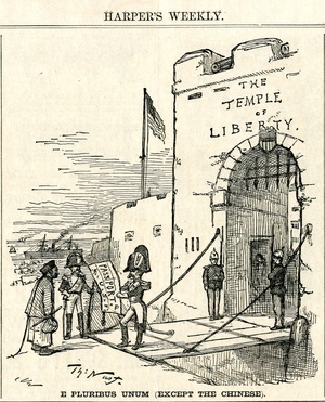 E pluribus unum (except the Chinese) : an der Grenze der USA, die als Burgtor mit Fallbrücke dargestellt wird, kontolliert ein Wächter den Pass eines Chinesen / Th. Nast