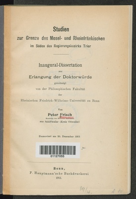 Studien zur Grenze des Mosel- und Rheinfränkischen im Süden des Regierungsbezirkes Trier / von Peter Frisch