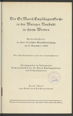 Die St. Mariä Empfängniskirche in der Mainzer Neustadt in ihrem Werden : Gedenkblätter zu ihrer feierlichen Grundsteinlegung am 8. Dezember 1929 / [Anton Gallei]