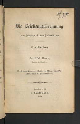 Die Leichenverbrennung vom Standpunkt des Judenthums : ein Vortrag : nebst einem Anhang: Kritik des Wiener'schen Gutachtens über die Feuerbestattung / von Dr. Isak Unna (Rabbiner in Mannheim)