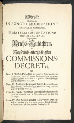 Abdrücke nachfolgender in puncto moderationis matriculae cameralis, et in materia sustentationis judicii cameralis, ergangener Reichs-Gutachten, und Kayserlich-allergnädigsten Commissions-Decreten, Als Num. I. Reichs-Gutachten in puncto Moderationis Matriculæ Cameralis vom 8. Novembr. 1726. so zu Regenspurg den 12. Novembr. h. a. publice dictiret worden, mit Beylagen Lit. A. B. & C., Num. II. Das hierauf ergangene Kayserliche Commissions-Decret vom 2. Novembr. 1727. und dictirt den 3. ejusdem mit der Beylag Num. 1., Num. III. Reichs-Gutachten in materia Sustentationis Judicii Cameralis vom 8. Novembr. 1726. & dict. den 12. hujus., Num. IV. Das hierüber unterm 2. Novembr. 1727. erlassene - und den 3. 4. & 5. dito publicè dictirte Kayserl. Commissions-Decret, mit der Beylag Lit. A.