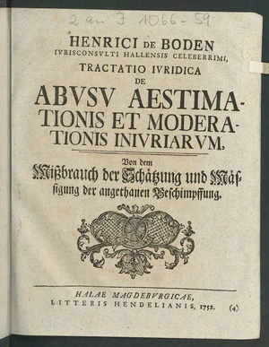Henrici De Boden Ivrisconsvlti Hallensis Celeberrimi, Tractatio Ivridica De Abvsv Aestimationis Et Moderationis Inivriarvm, Von dem Mißbrauch der Schätzung und Mäßigung der angethanen Beschimpffung