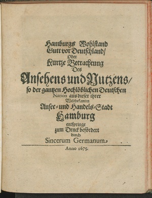 Hamburgs Wohlstand Gutt vor Deutschland : Oder Kurtze Betrachtung Des Ansehens und Nutzens/ so der gantzen Hochlöblichen Deutschen Nation aus dieser ihrer Weltbekanten Ansee- und Handels-Stadt Hamburg entspringe / zum Druck befördert durch Sincerum Germanum