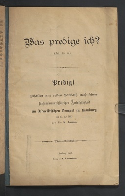 Was predige ich? : Predigt gehalten am ersten Sabbath nach seiner fünfundzwanzigjährigen Amtsthätigkeit im Israelitischen Tempel zu Hamburg am 15. Ab 5643 / von Dr. H. Jonas