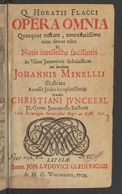 Q. Horatii Flacci Opera omnia : Quotquot extant / emendatissime nunc denuo edita ; et notis intellectu facillimis in Vsum Juuentutis Scholasticae ad modum Johannis Minellii illustrata ; Accessit Jndex locupletissimus Studio Christiani Junckeri, ...