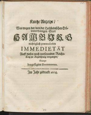 Kurtze Anzeige/ Was wegen der/ von der Hollsteinischen Erbvnterthänigen Statt Hamburg nichtiglich praetendirten Immedietät Auff diesen noch vorseyenden Reichs-Tag zu Regenspurg vorgangen : Sampt beygefügten Documenten