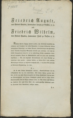 Friedrich August, von Gottes Gnaden, souverainer Herzog zu Nassau [et]c. [et]c. und Friedrich Wilhelm, von Gottes Gnaden, souverainer Fürst zu Nassau [et]c. [et]c. Nachdem Uns die Anzeige gemacht worden, daß Kaiserlich französische Unterthanen und Bewohner des linken Rheinufers, in einigen Gränzorten Unsers Herzogthums Niederlagen von solchen Waaren, deren Einbringen nach Frankreich ... ganz untersagt, oder doch mit starken Eingangstaxen belegt ist, in der gesetzwidrigen Absicht unterhalten, dieselben auf mancherley Wegen des Schleichhandels unter der Hand nach Frankreich einzuführen ... Gegeben Biebrich den 22ten und Weilburg den 26ten März 1808
