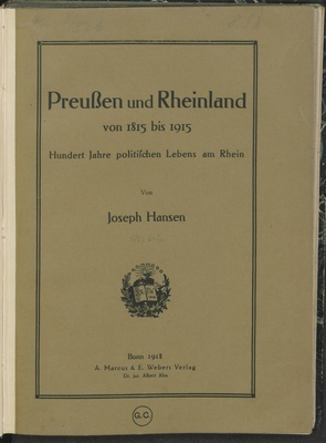 Preußen und Rheinland von 1815 bis 1915 : hundert Jahre politischen Lebens am Rhein / von Joseph Hansen