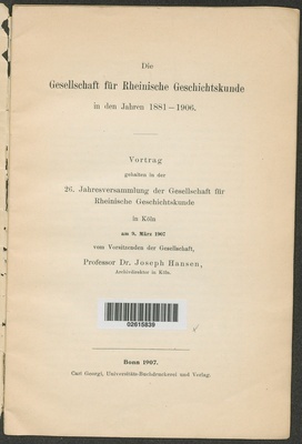 Die Gesellschaft für Rheinische Geschichtskunde in den Jahren 1881 - 1906 : Vortrag, gehalten in der 26. Jahresversammlung der Gesellschaft für Rheinische Geschichtskunde in Köln am 9. März 1907 / von Joseph Hansen