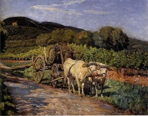 Kuhfuhrwerk im Weinberg
