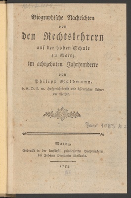 Biographische Nachrichten von den Rechtslehrern auf der hohen Schule zu Mainz im achtzehnten Jahrhunderte / von Philipp Waldmann
