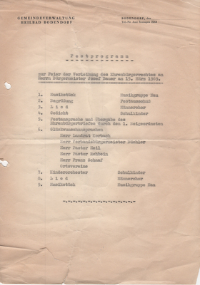 Maschinengeschriebenes Festprogramm zur Feier der Verleihung des Ehrenbürgerrechtes an Herrn Bürgermeister Josef Bauer am 15. März 1969
