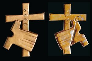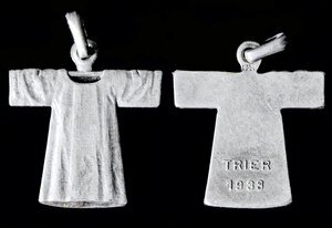 Acht Wallfahrtsabzeichen zur Ausstellung des heiligen Rocks im Dom zu Trier 1959 in einer Schachtel der Firma Lamy/Füller