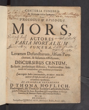 Centuria funebris in scenam vitae humanae : cuius prologus & epilogus mors, actores varia mortalium funera ... discursibus centum ex sacris, profanisque historiis, traditionibus, sententiis & lemmatibus, pro moderno personarum statu / cum triplici ind. concionatorio ... repraesentata ab Thomas Höflich