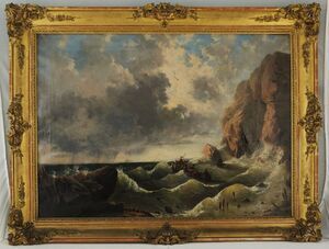 Schiffbrüchige im Kahn vor Felsenküste