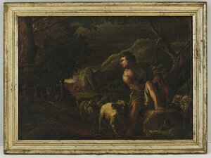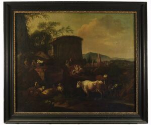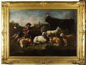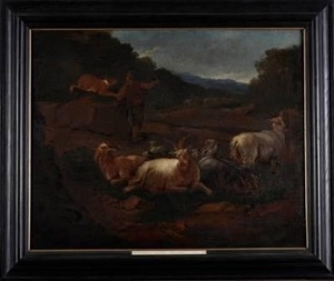 Tierstück. Landschaft mit sitzendem Hirt und Ziegenherde und Stier