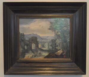 Waldlandschaft mit Ruinen und figürlicher Staffage