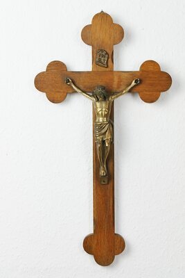 Neugotisches Holzkreuz mit Korpus aus Messing