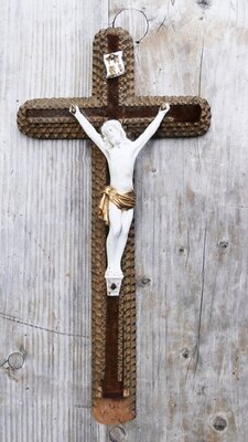 Aufwendig hergestelltes Holzkreuz mit christliche Kreuzigungsdarstellung