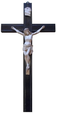 Neugotisches Holzkreuz mit Korpus aus Biskuit-Porzellan